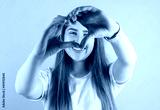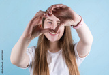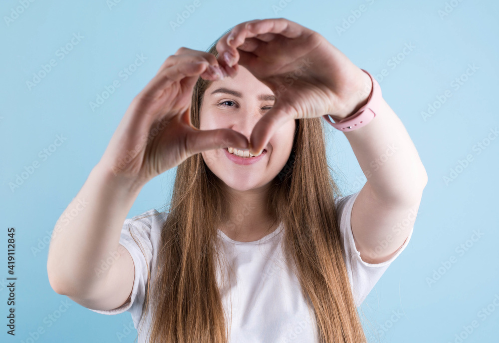Photo portrait of girl making heart shape with fingers on one eye looking through it isolated on pastel blue background