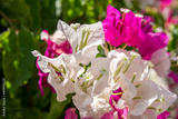 Close up on beautiful pink bougainvillea flowers. Bright fuchsia colored petals of the Aegean. Typical sign of summer. Blurry and natural background with copy space