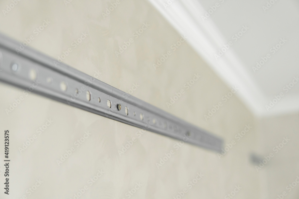 Close-up of stainless steel mounting rail for mounting kitchen cabinets on a wall.