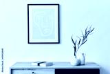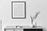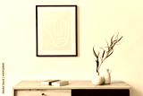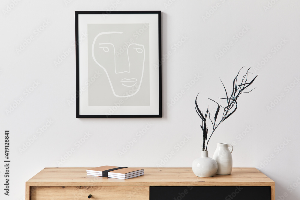 Stylish interior of living room with mock up poster frame, wooden commode, book, leaf in ceramic vase and elegant personal accessories. Minimalist concept of home decor. Template.