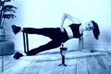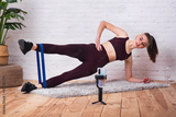 The girl is engaged in fitness at home. Interactive video chat training. Online Sports occupation