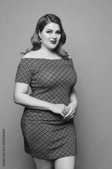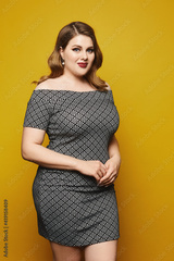 A young plump woman in a short grey dress poses over a yellow background, isolated