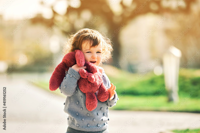 Outdoor portrait of adorable toddler girl playing wirh pink bunny toy