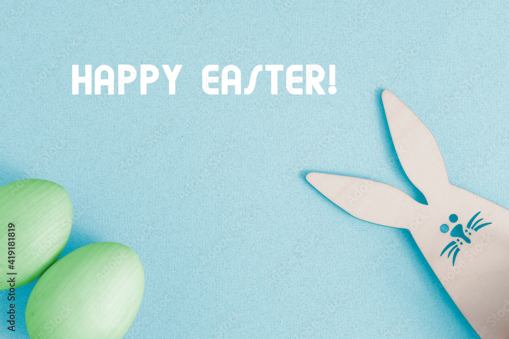 Happy Easter greeting card. On a blue background, congratulations on Easter. Bunny Rabbit peeks out from the bottom right corner. In the left corner are two colored eggs.