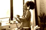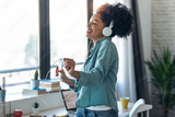 Motivated young afro woman listening to music with headphone while dancing in living room at home.