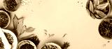Creative food frame mockup with various types of spices Bay leaf, red chili pepper, anise in wooden bowls on a mocca beige color background with copy space. Long food banner with copy space.