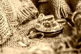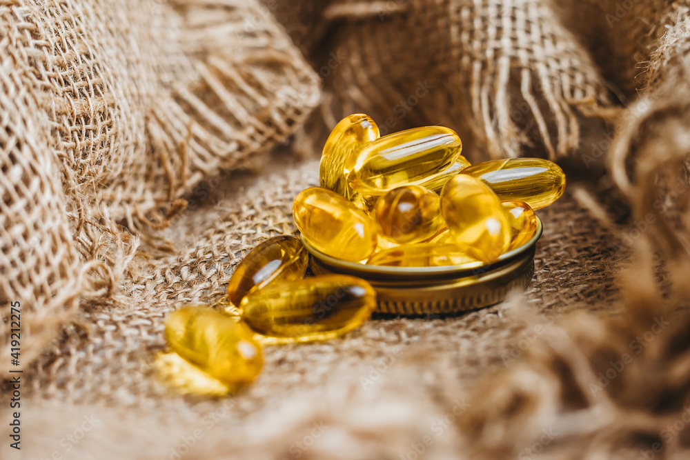 Fish oil pills, tablets on the burlap. Vitamin complex omega 3,6,9. Fish oil capsules with omega-3, vitamin D. Close up