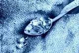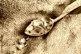 Fish oil capsules in a wooden spoon. Fish oil pills, tablets on the burlap. Vitamin complex omega 3,6,9. Fish oil capsules with omega-3, vitamin D. Top view. Copy space