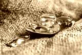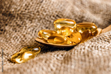 Fish oil capsules in a wooden spoon. Fish oil pills, tablets on the burlap. Vitamin complex omega 3,6,9. Fish oil capsules with omega-3, vitamin D