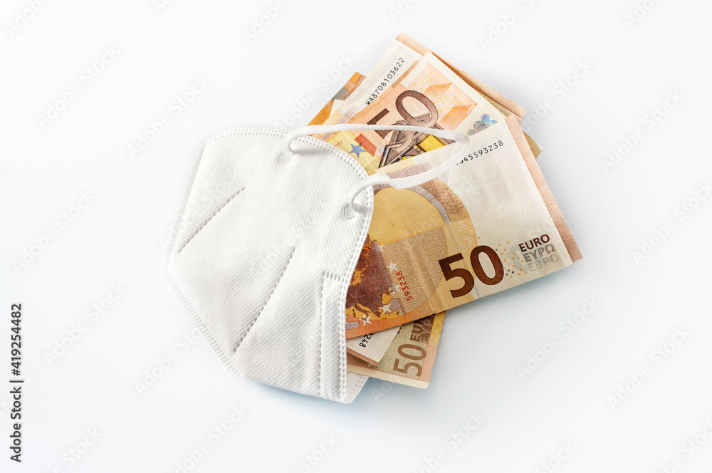 ffp2 medical protection face mask against coronavirus filled with euro banknotes, concept for rising costs in health care or enrichment by corruption, white background with copy space