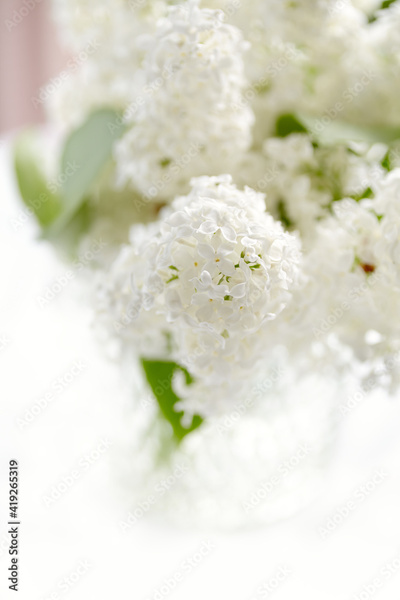 Fresh cut white lilac blossoms in a vase in natural light