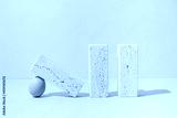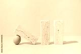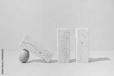 Egg holding a travertine marble block on a beige and gray background. 2021 Easter unique still life concept. Surreal retro abstract idea.