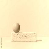 Egg on top of travertine marble block on a beige and gray background. 2021 Easter unique still life concept. Surreal retro breakfast food composition.