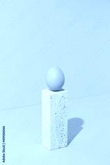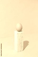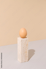 Single egg standing on a travertine marble block on a beige and gray background. 2021 Easter unique still life composition. Surreal retro creative organic food concept.