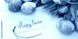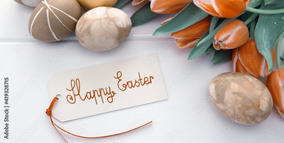 Easter card with bouquet of tulips and colorful eggs on white wooden .