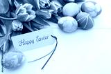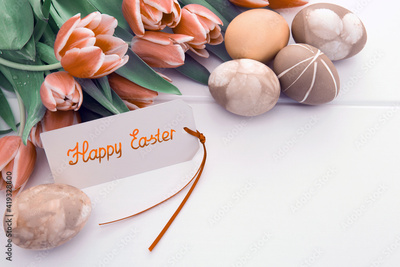 Easter card with bouquet of tulips and colorful eggs on white wooden .