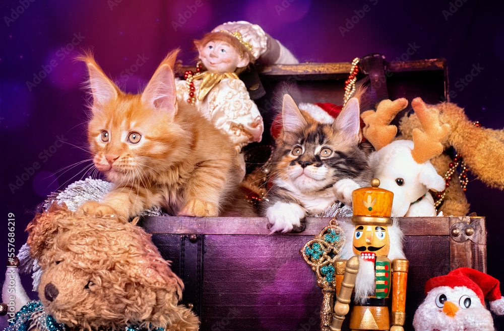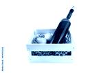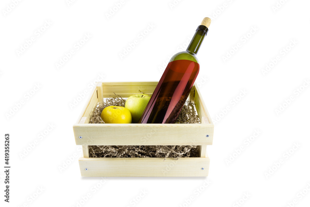 Bottle of red wine with cork and two apples in wooden box with paper shavings, isolated on white background.