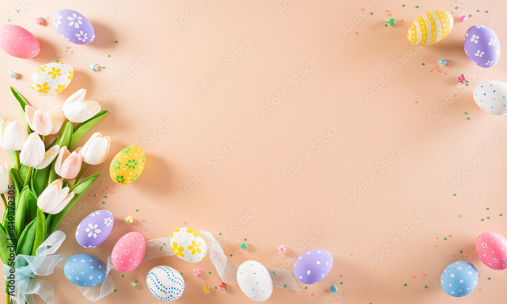 Happy easter! Colourful of Easter eggs in with flower on pastel background. Greetings and presents for Easter Day celebrate time. Flat lay ,top view.