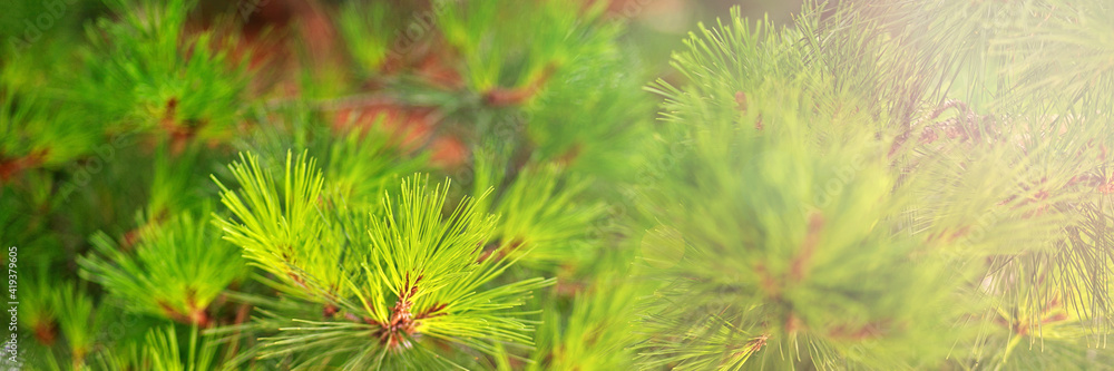 Summer abstract background with pine tree leaves. Ultra-wide panoramic landscape, banner format.