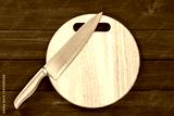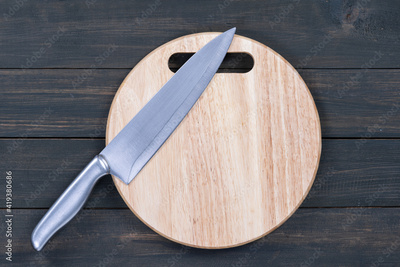 Close up kitchen knife on wooden round cutting board