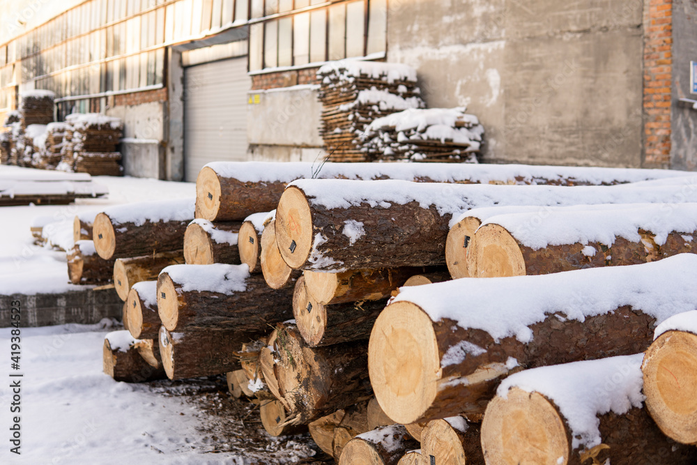 A pile of logs on a sawmill under the layer of snow in the winter season.