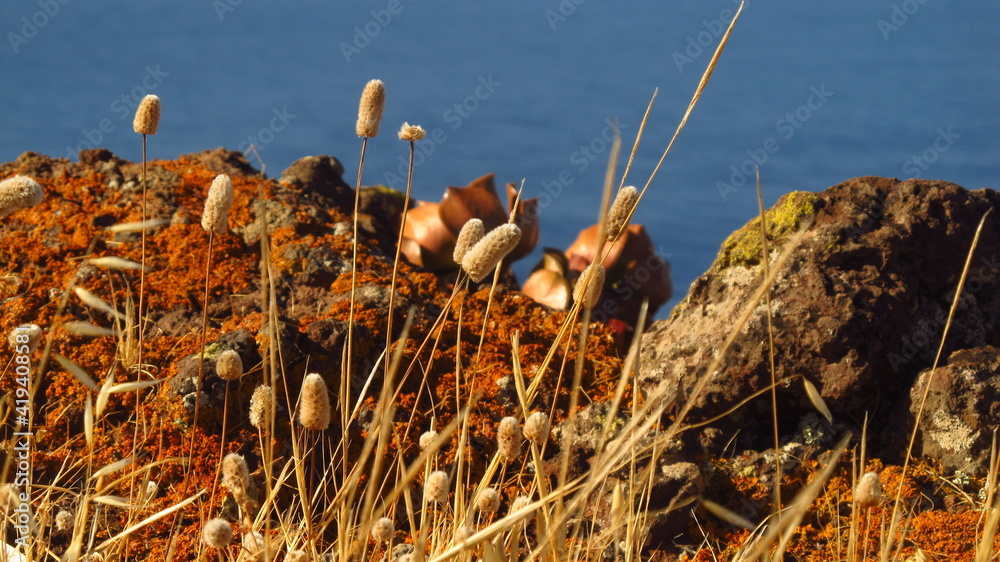 Suche rośliny na tle kamienia i oceanu na Maderze, Portugalia