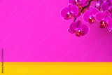 Beautiful purple orchid flowers over bright violet yellow background with copy space. Greetings card. Happy womans day.