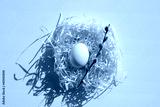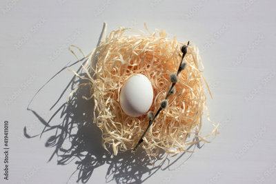 Spring flat lay composition with white easter egg in nest and pussy-willow catkins on white background. Top view, copy space. Hard light, shadow