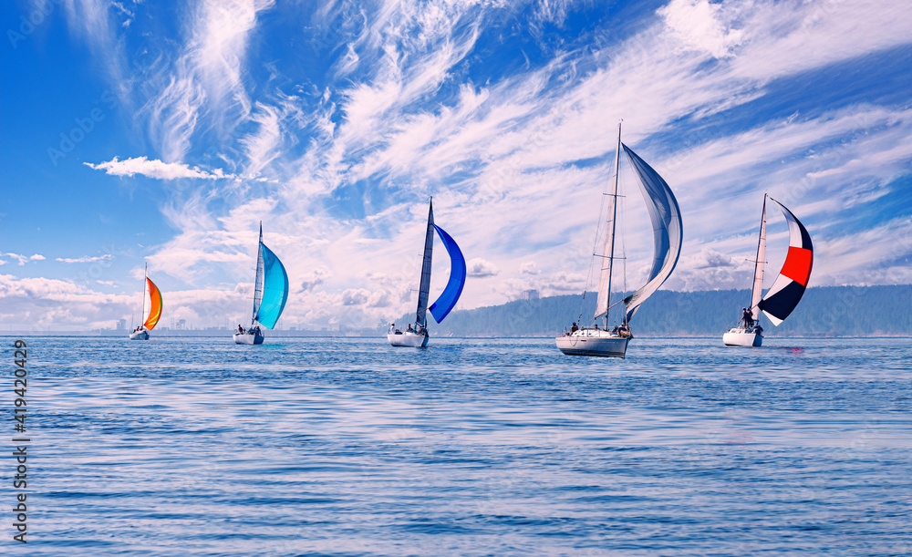 Five sailing yachts sail under a beautiful sky with cirrus clouds, the reflection of the sun in the water, there is a light fog on the shore.
