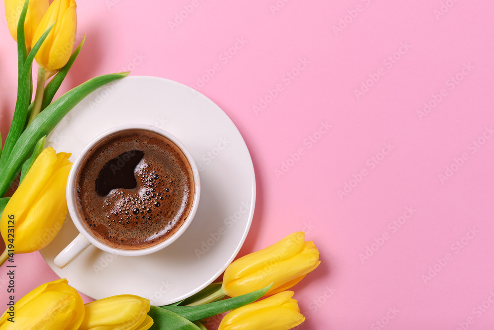 yellow tulips, a cup of black coffee on a pink background, a place for the inscription