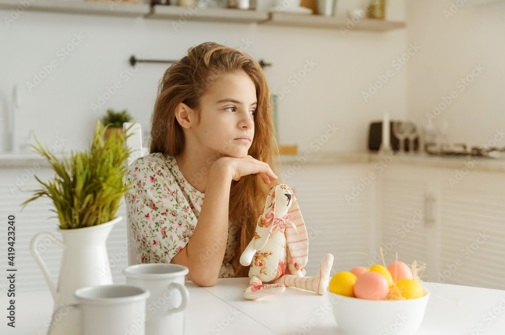european girl 10 years old in the kitchen at the table with Easter eggs