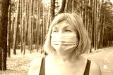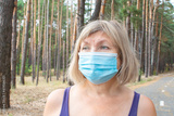 Beautiful senior woman in a medical mask walks outdoors in the park on a treadmill. Feeling happy with nature background, health of the elderly. Enjoying a summer day in the nature, freedom concept.