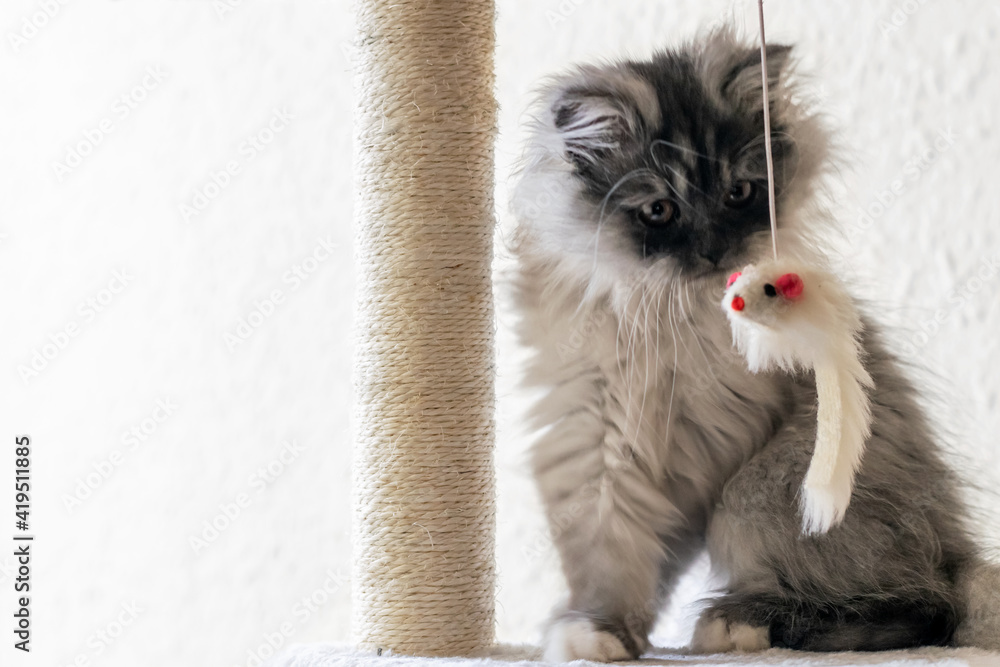 Nice grey little kitten looking at mouse toy. World Pet Day. Space for your text, information or any more.