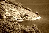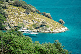 Summer concept: Luxury white yacht boat anchored stern in a bay with blue turquoise waters. View from land with green trees and sea in background with copy space