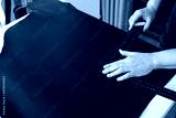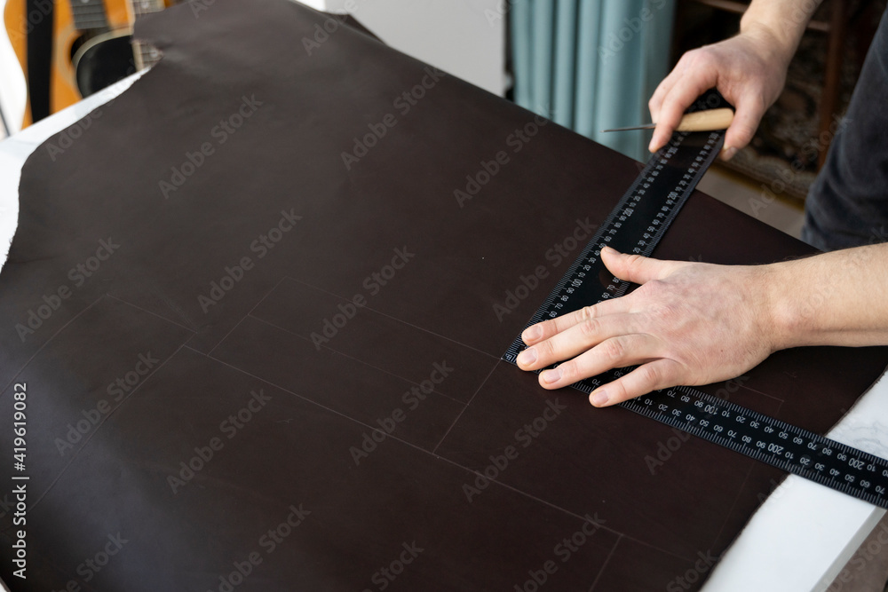 Men's hand holding a awl and metal ruler and working on a leather wallet in his workshop. Working process with a brown natural leather. Craftsman holding a crafting tools and put marks on a leather.