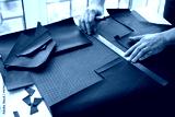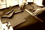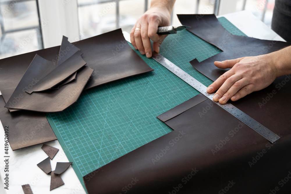 Men's hand holding a stationery knife and metal ruler and cutting on a pieces for a leather wallet in his workshop. Working process with a brown natural leather. Craftsman holding a crafting tools.