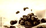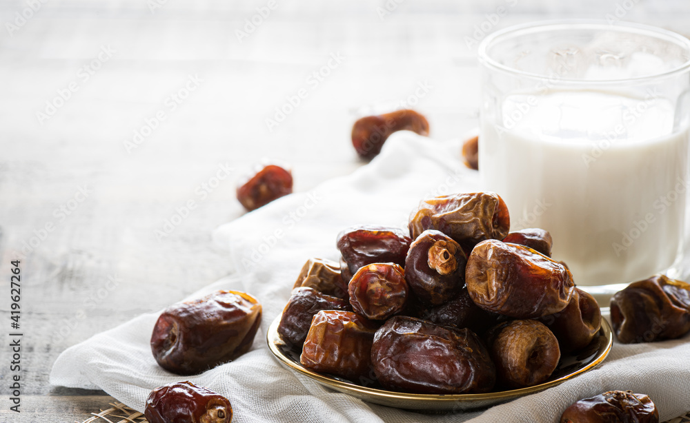 Milk and dates fruit on dark wooden background. Muslim simple Iftar concept. Ramadan food and drinks.