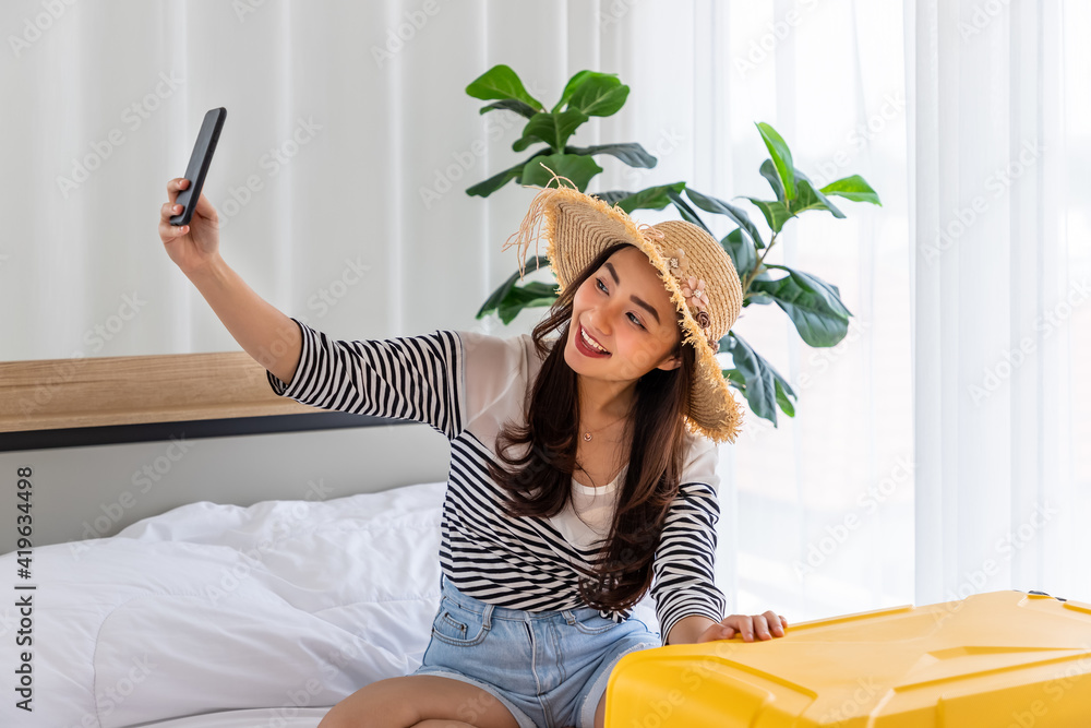 Happy Asian woman planning preparing travel trip suitcase luggage, sitting on bed in bedroom and selfie video call