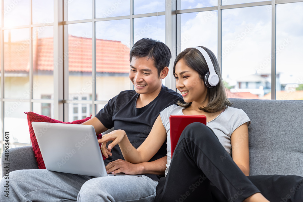 Young Asian couple relaxing sitting on sofa using laptop computer and digital tablet working from home