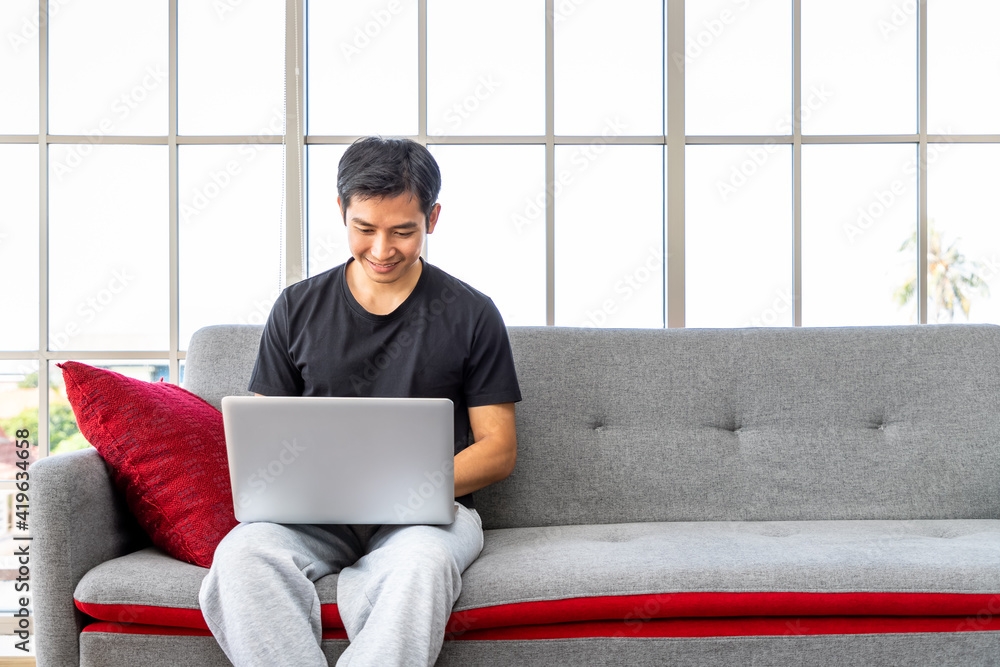 Happy young Asian man using laptop computer sitting o sofa in living room, work from home concept.