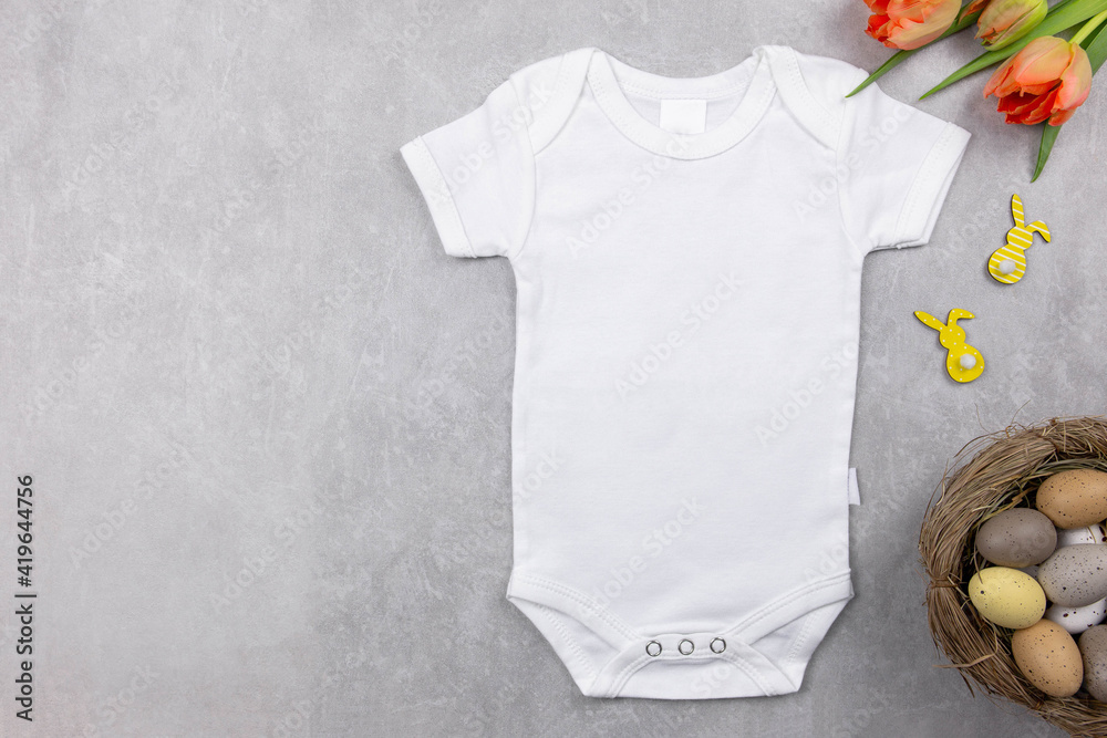 White baby girl or boy bodysuit mockup on the gray concrete background with tulips flowers and easter decoration. Design onesie template, print presentation mock up. Top view. Flat Lay. Copy space.