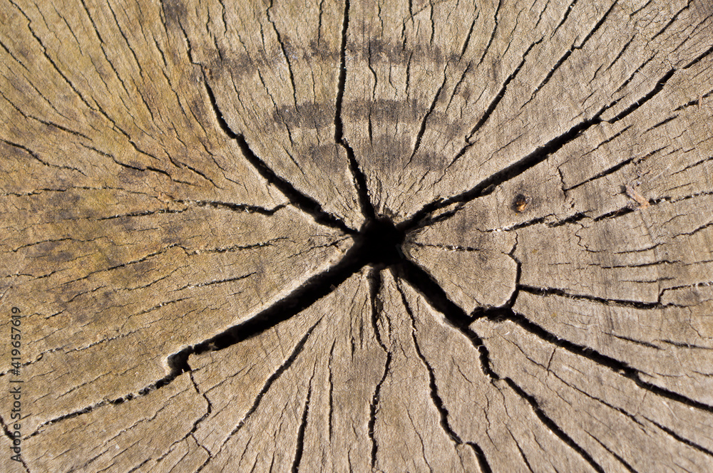 The texture of the old tree in place of the saw cut. Cracked tree stump