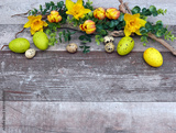 Narzissen und Ostereier auf altem Holz
