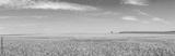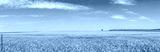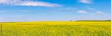 Yellow flower rapeseed field with blue sky on a clear sunny day panorama