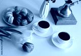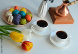 Two cup of coffee, multicolored macaroons, turkish coffee pot on white background, top view