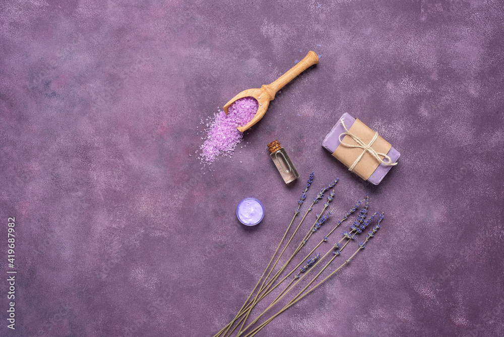 Lavender spa products on an on purple grunge background. Body care products with lavender-oil, salt, cream, soap and dried lavender flowers. Selective focus.