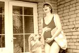A pregnant woman in a bathing suit plays with a dog leaving the house for a walk. Feeling happy with nature background. Enjoying a summer day in the nature, freedom concept, healthy pregnancy.