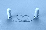 Love forever. A heart-shaped thread connects the figures of two people in love on a blue background.