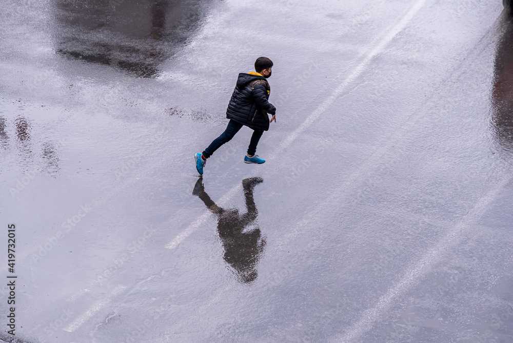 A boy running splashing under rain on street road. top view. Child having fun during rain. Spring outdoor activity for kids. Freedom and happy childhood lifestyle. He wear coat and blue shoes.