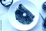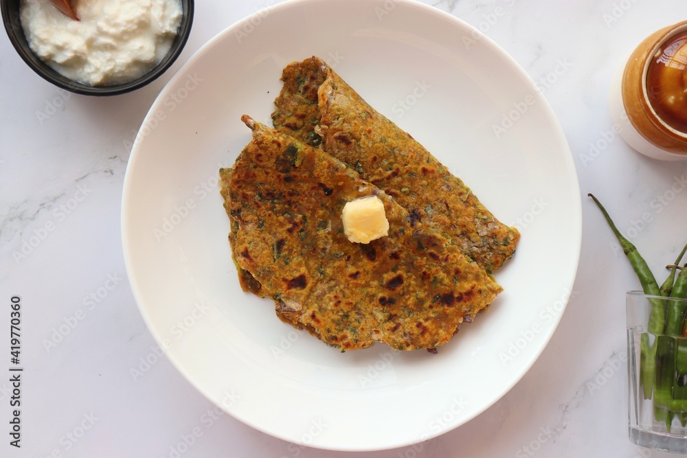 Radish or Mooli masala Paratha served on a white plate with butter cubes. Served with curd, pickle, and green chili. copy space. Muli ke parathe. Radish masala roti.